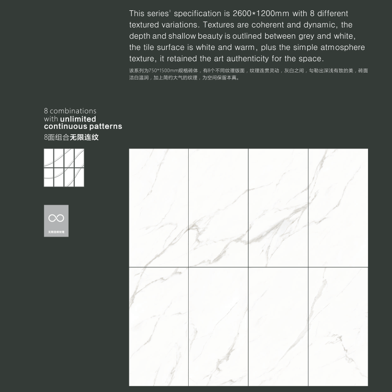 該系列為750*1500mm規(guī)格磚體,有8個(gè)不同紋理版面,無限連紋組合拼接,紋理連貫靈動(dòng),灰白之間,勾勒出深淺有致的美,磚面潔白溫潤,加上簡約大氣的紋理,為空間保留本真。