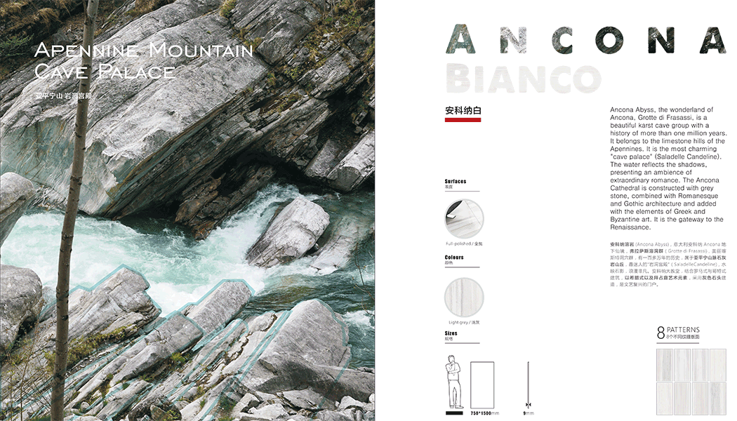 該系列為全拋產品,具有8個不同版面的紋理變化,750*1500mm規格磚體,米白色磚面,淺灰色輕柔紋理,觸感細膩,產品質地堅硬,經久耐用。